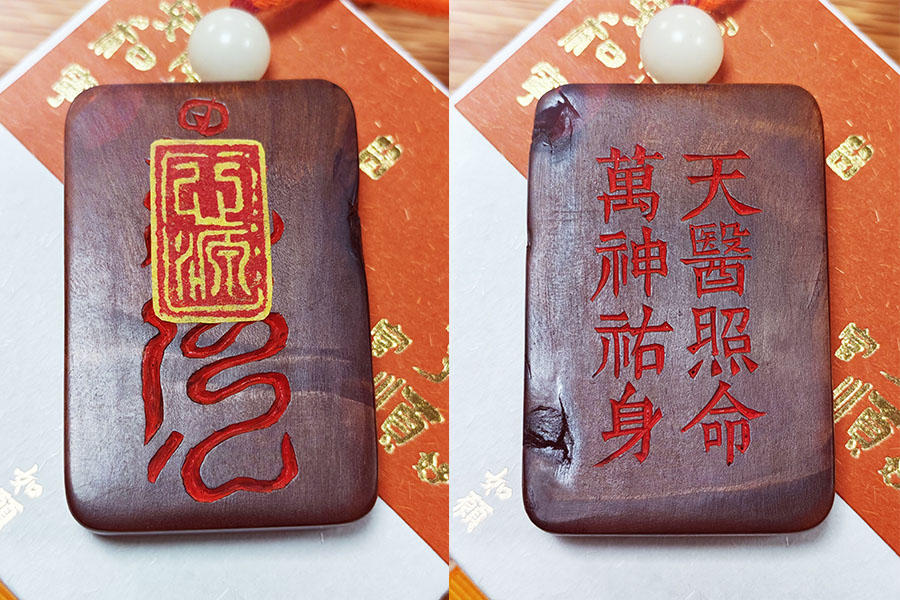全程纯手工雕刻、填朱,以师传天医秘法在法坛加持处理、过香火。